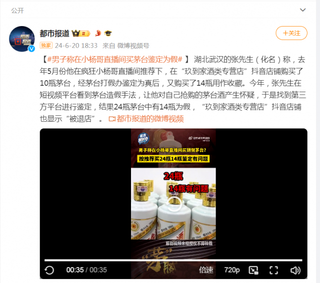 6月20日,有人称网红为网红疯狂小杨哥直播间的茅台,经第三方机构鉴定为假。当事人表示,生肖茅台的瓶盖可以拔下来换酒。根据第三方鉴定机构的鉴定结果,32瓶茅台中有13瓶被拔出,7瓶使用假瓶盖和假喷码。