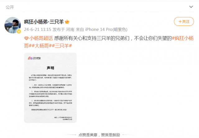6月21日,三只羊网官方微博发表声明,感谢所有关心和支持三只羊的兄弟。
