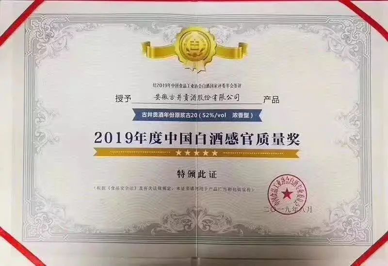 ▲ 古井贡酒获得2019年度中国白酒感官质量奖