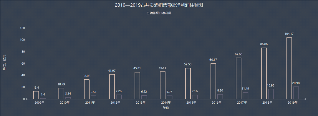 ▲ 2009—2019古井贡酒销售额净利润柱状图