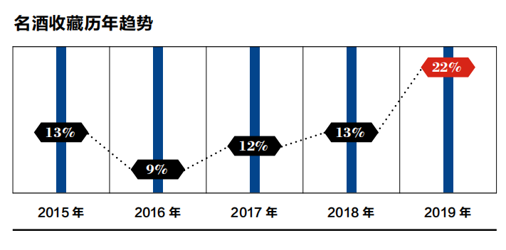 根据《2019胡润百富高净值人群生活方式与品牌倾向调研》数据,名酒作为高净值人群的收藏对象,近5年稳步上升,在2019年高净值人群收藏中排名第一。而《中国老酒市场指数》指出:2021年,老酒的市场规模将突破千亿。