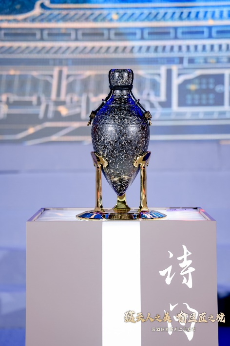 「御载」记录了清中叶被《四库全书》收录的中国白酒名垂青史的盛会:“中国汾酒诗会” 。宝石釉酒器以天然海蓝宝石为釉,海水江崖双龙赶珠纹与回型纹相互交织。非遗木盒还原王艺《水系列》作品,非遗大漆工艺描摹中国山水的流动飘逸。