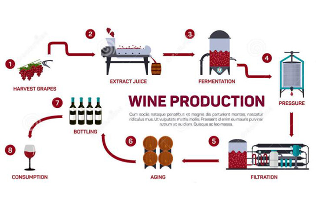 用最简单的术语来说,葡萄酒是通过种植葡萄,采摘和压碎这些葡萄,使其果汁发酵并将所得液体装入瓶中而制成的。最重点的制作步骤是:采摘-压碎-发酵-过滤-装瓶-存放(老化),最后完成葡萄酒的出产。