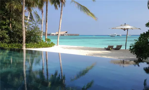 第一眼俯瞰到酒店的全景非常振奋, 海水蓝得不真实!水飞着后,酒店的CEO和GM两位都来亲接, 上岛后才惊觉全部工作人员都是用法语来问候的住客的, 之后的几天也都是Bonjour 代替了hello和good morning。