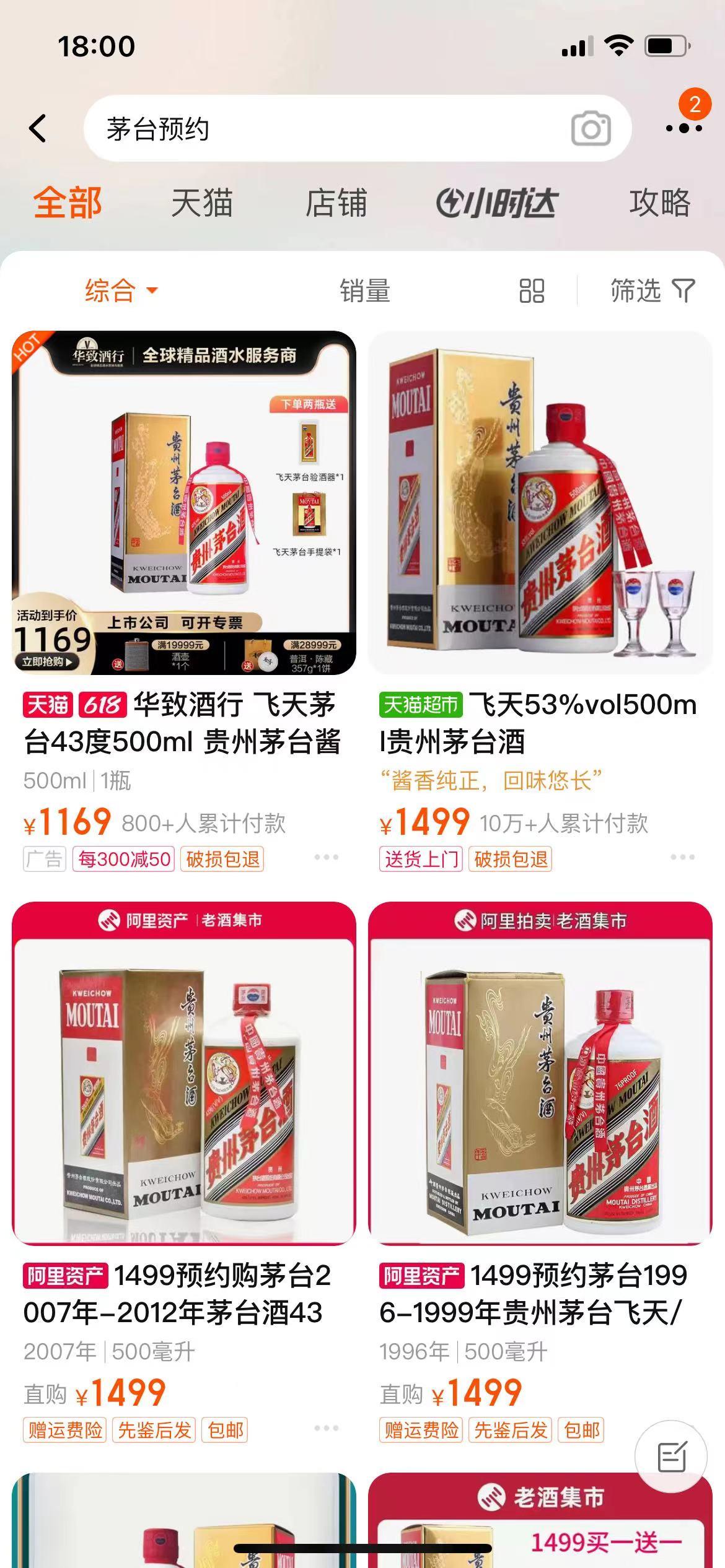 京东也采取了相同的玩法,消费者可在京东APP上搜索京东超市“618”预约抢1499元飞天茅台。