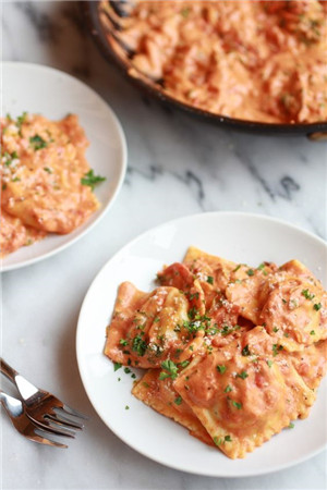 意式虾饺是一道风味浓郁的意大利菜肴,使用面团包裹丰富的海鲜类食材做成。虾饺的馅通常包含奶酪或甲壳类食物,如螃蟹和龙虾等。烹制虾饺时,厨师可以使用较浓稠的奶油酱、红酱等来形成厚重的口味,或者使用简单的黄油和柠檬即可。选用不同的酱汁会影响到葡萄酒的搭配,但是不论白酒、红酒还是起泡酒,我们都能够从中找到心意的选择。