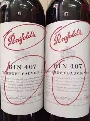 另外,真酒标签上有防伪标志,像BIN系列的128?389?407等等不但UV通透明亮,LOGO立体感强,而且红色文字下面的UV图案里面有防伪设计;奔富707等高端酒,不但有金色防伪丝印。还有钢印的图案和防伪,钢印凸起的图案有很强的立体感,技术非常高,很难模仿;