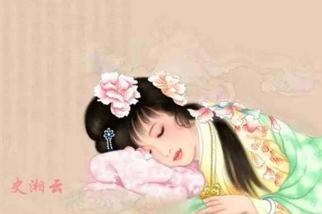如62回写宝玉生日时,众人都在行酒令。湘云吃醉了图凉快,在山子后头一块青石板凳上睡着了。只见她醉眠花丛,芍药花飞洒在酒醉的脸上和华美的衣襟上,连掉在地上的扇子,有一半也埋在落花里。酣梦中她还念念不忘说着酒令:“泉香酒冽……醉扶归……宜会亲友!”瞧,少女、鲜花、蜂蝶,这美的意境、美的形象、美的梦呓,造成一种令人神往的真善美的境界,给人一种全新的审美感受。这种醉酒的表现衬出了史湘云那“英豪阔大宽宏量”、天真活泼、豪爽达观、不拘礼节的个性特征。作者就在这美的画图中,为我们刻画出一个美的性格、美的心灵的“睡美人”艺术形象,令人如临其境,如睹其情,如见其丰姿憨态、睡状醉貌。